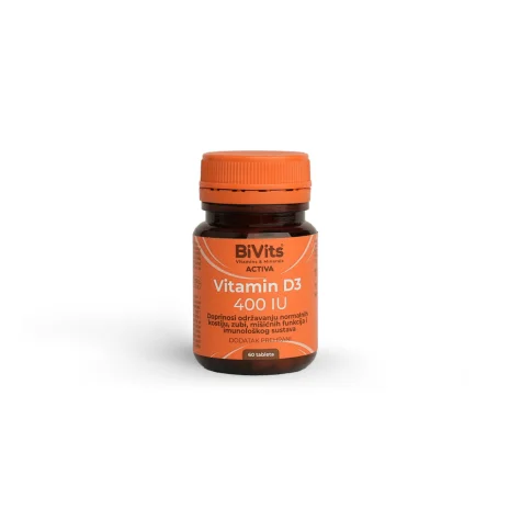 BiVits ACTIVA Vitamin D3 400IU tablete formula su koja sadrži 400 IU vitamina D3 u jednoj tableti namijenjena je svakodnevnoj potpori organizmu i sprječavanju razvoja nedostatka vitamina D3.