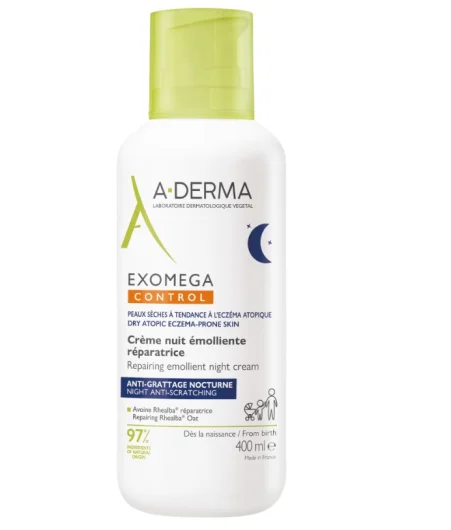 A-derma Exomega Control obnavljajuća noćna krema trenutačno umiruje svrbež. Za mirnu noć i obnavljajući san. Obnavlja kožnu barijeru. Za lice i tijelo.
