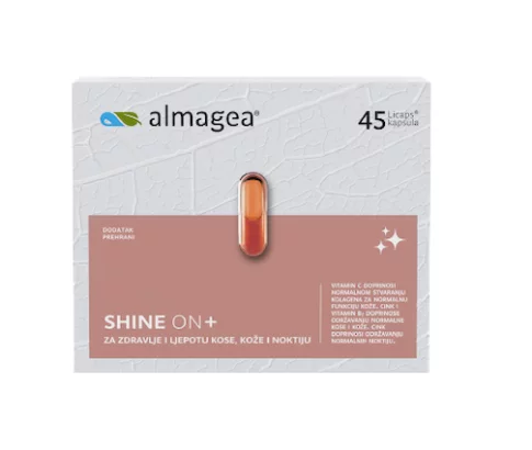 Almagea Shine On+ je inovativna formulacija koja u inovativnim Licaps kapsulama sadrži kompleks vitamina, minerala i biljaka koji pomaže održavanju zdrave i guste kose, noktiju te sjajnije i zdravije kože.