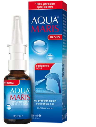 Aqua Maris Strong sprej za nos je 100%-tna pročišćena morska voda. Prirodni je dekongestiv, odčepljuje nos i preporučuje se kod alergija i prehlada. Uklanja višak tekućine iz sluznice nosa, smanjuje njeno oticanje i omogućava bolje disanje. Djeluje trenutno i donosi olakšanje.