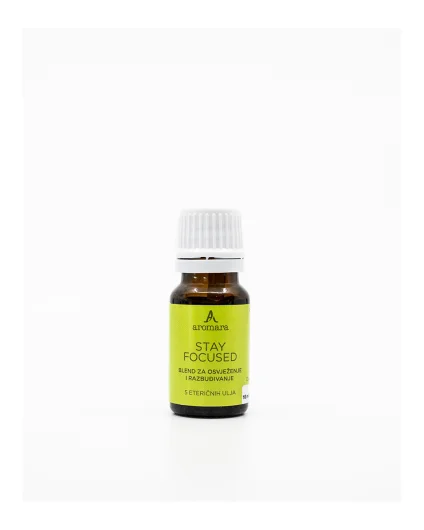 Aromara STAY FOCUSED mješavina eteričnih ulja 100% je prirodni blend za osvježenje i mirisnu animaciju prostora. Sastavljen od 5 energizirajućih eteričnih ulja.