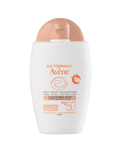 Avene Sun mineralni fluid za zaštitu od sunca SPF50+ savršeno je prikladan za kožu koja ne podnosi kemijske filtre i parfeme. Lagana, fluidna tekstura hidrira osjetljivu i netolerantnu kožu, bez masnog sjaja. Tonirani fluid.