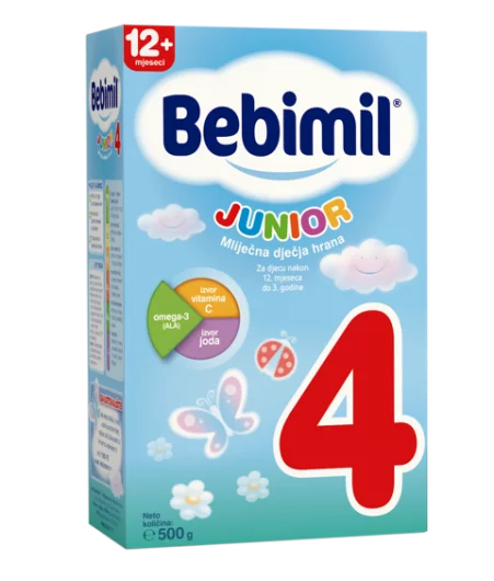 Bebimil Junior sadrži hranjive sastojke neophodne za zdrav rast i razvoj Vašeg mališana: bjelančevine prilagođene dobi djeteta, željezo za prevenciju anemije (sadrži 20 puta više željeza od kravljeg mlijeka), omega 3 masne kiseline koje su važne za razvoj mozga i živčanog sustava. Zbog svojeg sastava, primjereniji je i zdraviji od kravljeg mlijeka djeci od 1. do 3. godine života.