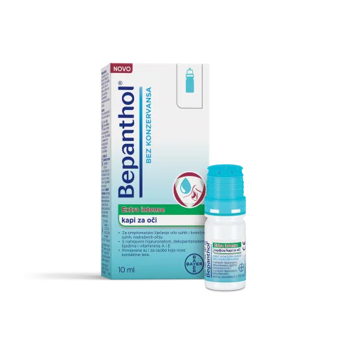 Bepanthol Extra intense kapi za oči su medicinski proizvod. Pružaju intenzivnu i dugotrajno ublažavanje simptoma vrlo suhih, kronično suhih, nadraženih očiju te njeguju i vlaže. Kapi su sterilne, bez konzervansa, s posebnim aktivnim kompleksom koji sadrži lipide, hijaluronsku kiselinu te vitamine A i E - za zaštitu i vlaženje površine oka, bez ometanja vida.