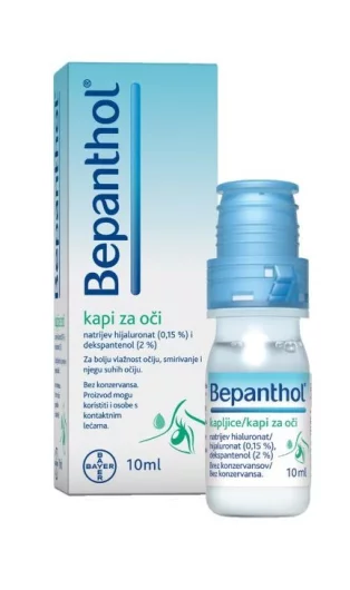 Bepanthol kapi za oči sadrže natrijev hijaluronat 0,15% i dekspantenol 2%, a namijenjene su primjeni kod suhih i nadraženih očiju. Bepanthol kapi zahvaljujući svojim sastojcima intenzivno vlaže i smiruju oči. Bepanthol kapi za oči stvaraju na rožnici oka sterilan, proziran zaštitni film, a da se ne smanjuje sposobnost vida. Koriste se kod mehaničkih opterećenja oka kao posljedica nošenja kontaktnih leća ili dijagnostičkih pretraga oka, kod preopterećenja očiju, zbog rada na računalu, boravljenja u klimatiziranim prostorima, vjetra, hladnoće, suhog ili zagađenog zraka. Ne sadrže konzervanse.
