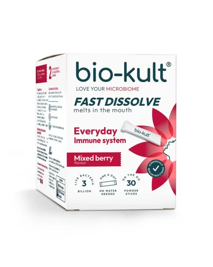 Bio-Kult Fast Dissolve Immune je dodatak prehrani sa živim kulturama mikroorganizama u kombinaciji s vitaminom C i D. U obliku praška koji se brzo otapa direktno u ustima, ugodnog okusa miješanih bobica. Formula ne sadrži umjetna bojila ni arome, bez glutena je i pogodan za vegetarijance.