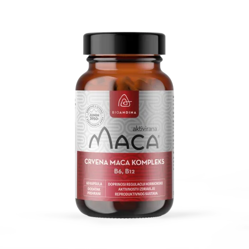 Bioandina Crvena Maca kompleks su kapsule koje sadrže aktivirani ekstrakt crvene mace (15:1) i vitamine B6 i B12. Količina aktiviranog ekstrakta u jednoj kapsuli odgovara količini od 3000 mg praha sirove mace, a što u dvije kapsule (preporučenoj dnevnoj dozi) iznosi 6000 mg. Doprinosi regulaciji hormonske aktivnosti i zdravlju reproduktivnog sustava. Sadrži vitamine B6 i B12 koji su važni za: