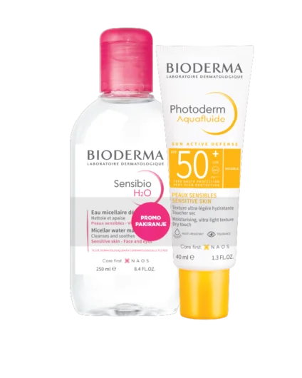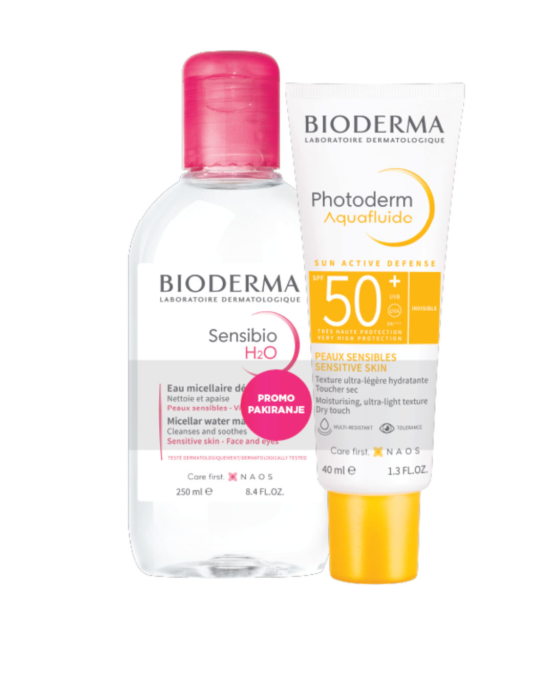 Bioderma Photoderm Aquafluide SPF50+ promo paket sadrži Photoderm Aquafluide visoku zaštitu od sunca uz micelarnu otopinu namijenjenu čišćenju osjetljive kože.
