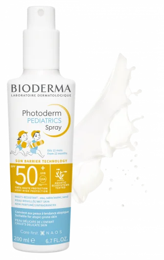 Photoderm Pediatrics Spray SPF50+ pogodan za dječju kožu od 12 mjeseci. Prikladan je za atopičnu kožu. Patentirana formula sadrži samo 4 organska filtera, pružajući zaštitu širokog spektra sa SPF50+ i UVA 25.
