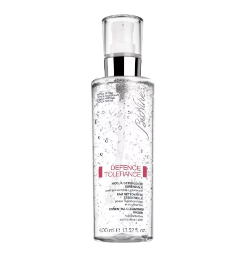 BioNike DEFENCE TOLERANCE Essential cleansing water nježno je sredstvo s ružinom vodicom, pantenolom i probiotikom Lactobacillus fermentum, za čišćenje kože i uklanjanje šminke.