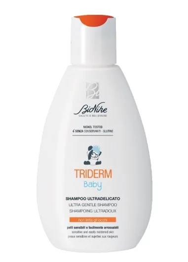 BioNike TRIDERM BABY blagi umirujući šampon za osjetljivo vlasište dojenčadi nježno pere krhku dječju kosu i osjetljivo vlasište novorođenčadi, dojenčadi i djece. Vrlo dobro je podnošljiv i idealan za umirenje nadraženog vlasišta. Sadrži sastojke za lako raščešljavanje i zaštitu vlasi kose. Ne izaziva nadražaj sluznice oka. Osobito pogodan kod ljuskanja vlasišta zbog tjemenice.