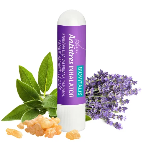 Biovitalis Antistres inhalator s eteričnim uljima praktični je džepni inhalator s eteričnim uljima koja opuštaju kod napetosti i stresa. Sadrži 100% organska eterična ulja valerijane, arapskog tamjana, kadulje, slatke naranče i prave lavande.