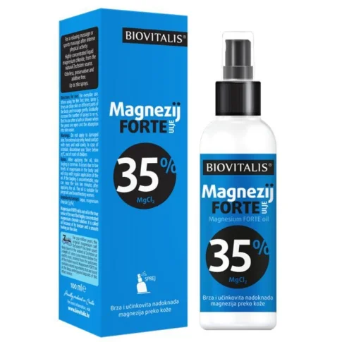 BIOVITALIS Magnezij FORTE ulje za masažu sadrži čak 35% magnezija za svakodnevnu nadoknadu magnezija preko kože.