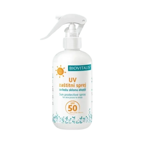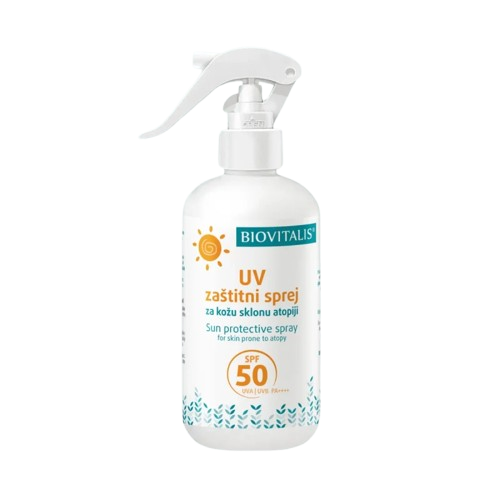 BIOVITALIS UV zaštitni sprej za kožu sklonu atopiji SPF50 pruža vrlo visoku zaštitu od sunca, a pritom je nježan prema osjetljivoj koži i koži s atopijskim dermatitisom. Formulacija s organskim UVA i UVB filtrima, ektoinom, sladićem i pantenolom osigurava visoku zaštitu i njegu, bez iritacija.