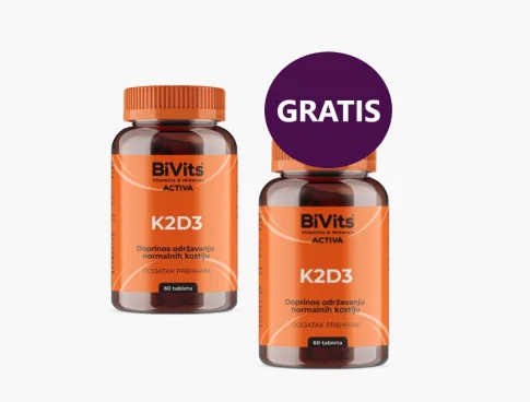 BiVits ACTIVA K2D3 sadrži optimalnu kombinaciju 1000 IU vitamina D3 (kolekalciferol) i 90 µg vitamina K2 (menakinon-7) u samo jednoj tableti dnevno.