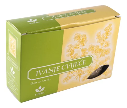 Suban Čaj Ivanje cvijeće uklanja štetne sastojke iz organizma i potiče rad jetre. Sadrži eterično ulje, flavonoide, saponine, trjeslovine. Djeluje diuretski, uklanja štetne sastojke iz organizma, potiče rad jetre. U"narodnoj medicini"kao kupka koristi se kod kožnih lišajeva i ekcema.