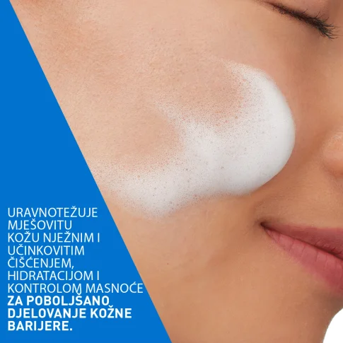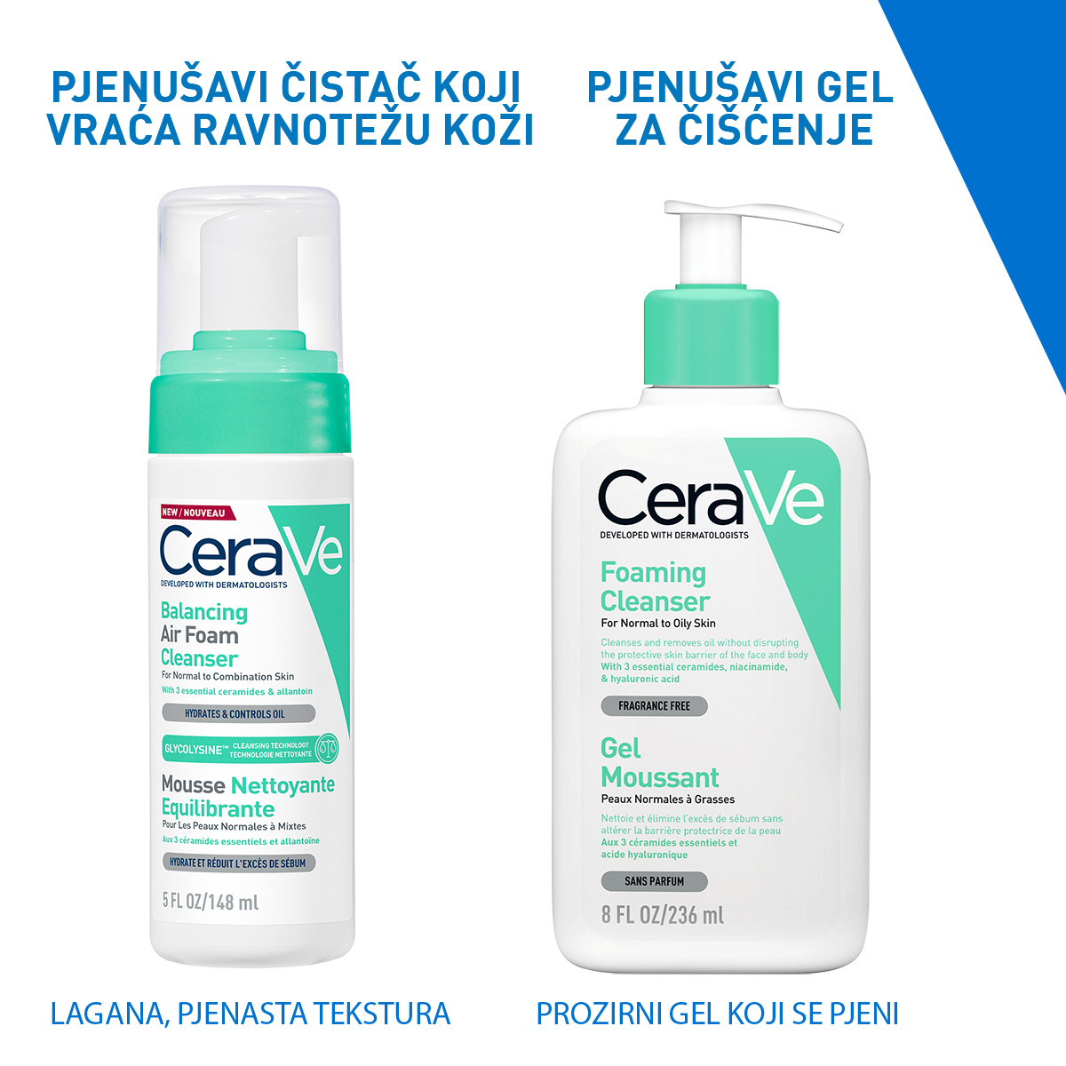 CeraVe Balancing Air Foam čistač nježno čisti, hidratizira i kontrolira masnoću za poboljšano djelovanje kožne barijere. Pokretan revolucionarnom tehnologijom čišćenja Glycolysine™, koja je u postupku patentiranja, u kombinaciji s 3 esencijalna ceramida i alantoinom, ovaj pjenasti čistač za lice uravnotežuje mješovitu kožu pružajući 8-satnu kontrolu masnoće i 24-satnu hidrataciju za poboljšano djelovanje kožne barijere.