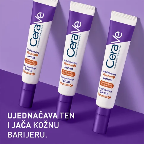 CeraVe Obnavljajući serum s vitaminom C ujednačava ten i jača kožnu barijeru. Sadrži 3 esencijalna ceramida, hijaluronsku kiselinu i vitamin B5 te 10% čistog vitamina C.