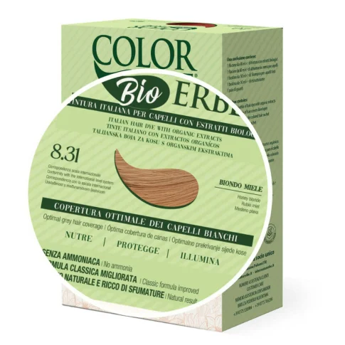 Color Erbe Bio boja za kosu bez amonijaka, temeljena na travarskoj tradiciji, s organskim ekstraktima cvjetova kamilice i nevena, pšeničnih klica, listova oraha i organskim uljem argana.
