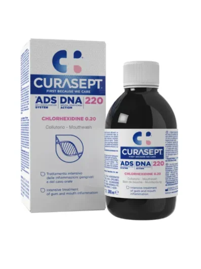 Tekućina za ispiranje usta Curasept ADS | DNA 220 nudi sveobuhvatnu podršku u liječenju desni nakon stomatoloških intervencija i kod teških upala desni. Klorheksidin i ADS sustav, bez alkohola. Održava zdravlje usne šupljine i bjelinu Vaših zubi.