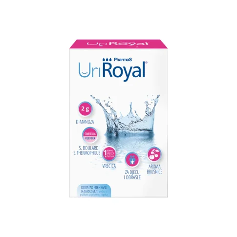 PharmaS UriRoyal® je dodatak prehrani za zdravlje mokraćnih puteva koji sadrži: D-manozu, kulturu živih kvasaca Saccharomyces cerevisiae var. boulardii I-3799 i kulturu tindaliziranih bakterija mliječne kiseline Streptococcus thermophilus HA-110. Pogodan za djecu od 3. godine i odrasle.