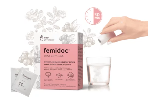 Femidoc D-manoza Uro Express se koristi kao pomoć pri liječenju infekcija urinarnog trakta, liječenju infekcija uzrokovanih bakterijom E.Coli. Aktivna tvar ovog proizvoda je D-manoza koja se veže na bakterije i sprječava njihovo prijanjanje na stijenke mokraćnog trakta. Femidoc ublažavaju simptome upale mjehura: boli, peckanja, smanjuju osjećaj potrebe za mokrenjem i učestalo mokrenje. Femidoc se može uzimati i preventivno. Okus brusnice.