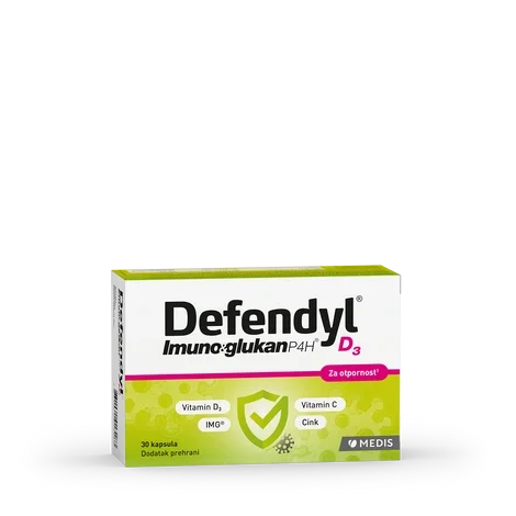 Defendyl Imunoglukan P4H D3 kapsule dodatak su prehrani za jačanje imuniteta s jedinstvenom kombinacijom prirodnog IMG® iz gljive bukovače te vitamina C, vitamina D i cinka, koji dokazano doprinose normalnoj funkciji imunološkog sustava.
