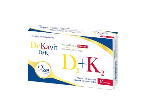 DeKavit D3+K2 kapsule dodatak su prehrani s vitaminom D3 uz dodatak vitamina K2 za bolju raspoloživost i iskoristivost u organizmu.