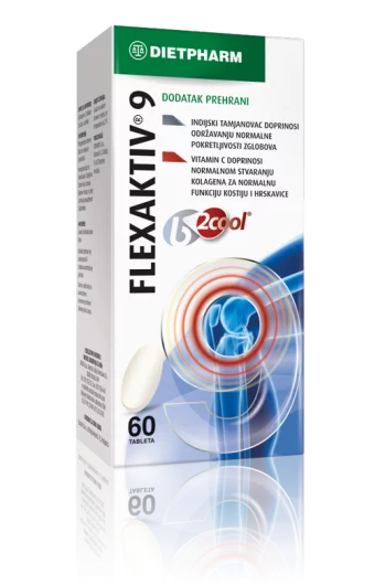 Dietpharm FLexaktiv 9 tablete su dodatak prehrani koje doprinose zdravlju zglobova i boljoj pokretljivosti. Sadrže glukozamin, indijski tamjanovac (Boswellia serata), kolagen tipa II, mangan, vitamin C, selen i suhi ekstrakt korijena đumbira. Flexaktiv tablete doprinose održavanju normalne pokretljivosti, stvaranju kolagena važnog za funkciju hrskavice i kostiju te vezivnog tkiva. Smanjuju ukočenost i pomažu boljoj pokretljivost.