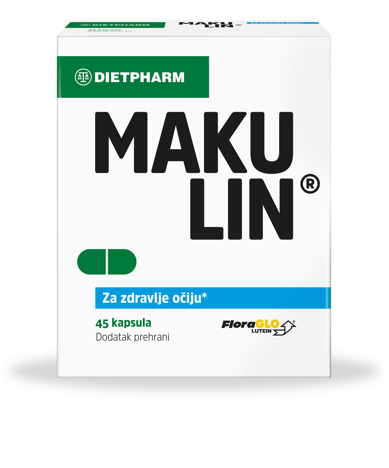 Dietpharm Makulin kapsule su nadopuna luteina i vitamina E kod makularne degeneracije i očne mrene. Uz optimalnu količinu luteina, FloraGlo sadrži i zeaksantin, pa tako osigurava najvažnije prirodne karotenoide neophodne za kvalitetu i gustoću očnog pigmenta, odgovornog za oštrinu vida. Njihovo djelovanje pojačano je dodatkom vitamina E, koji doprinosi sigurnoj i učinkovitoj zaštiti oka kod pojačanog naprezanja vida, rada na računalu ili pri umjetnom i nedovoljnom osvjetljenju kao i svima koji žele aktivno zaštititi svoj vid.