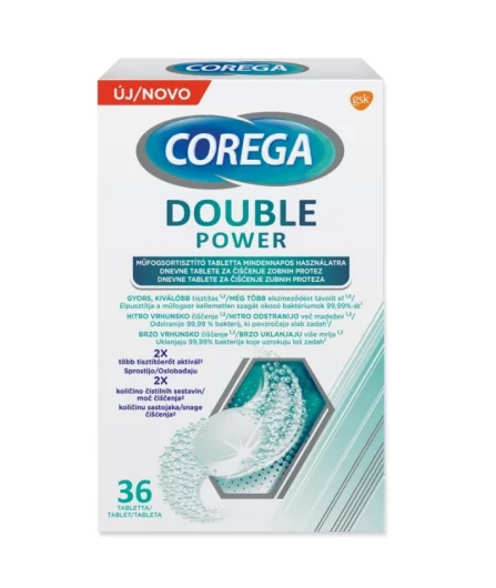 Corega Double power tablete za čišćenje zubne proteze su dnevne tablete za brzo i učinkovito čišćenje koje uklanjaju 99,99% bakterija. U odnosu na klasične Corega tablete sadrže dva puta jaču količinu aktivnih sastojaka koje pomažu ukloniti mrlje u samo nekoliko minuta. Tablete su nježne prema protezi i mogu se koristiti svakodnevno.