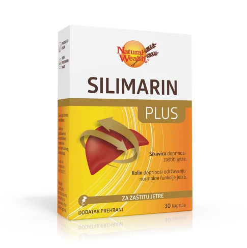 Natural Wealth Silimarin plus kapsule su dodatak prehrani za zdravlje jetre. Sadrže silimarin iz 175 mg ekstrakta ploda sikavice, kolin, vitamine B1, B2 i B12, niacina, folnu i pantotensku kiselinu, biotin i vitamin B6. Silimarin Plus sa svojim aktivnim sastojcima pruža zaštitu zdravlju i funkciji jetre.