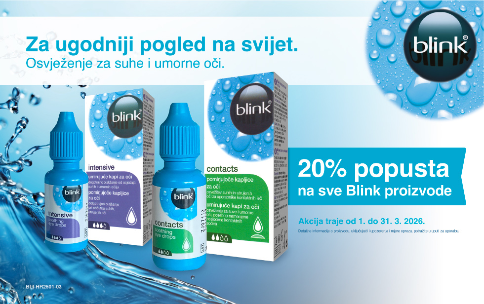 Iskoristite 20% popusta na Blink proizvode u Prima Farmacia webshopu! Blink je brend poznat po svojoj učinkovitoj njezi očiju, posebno za ublažavanje suhoće, iritacija i umora. S visokokvalitetnim kapima i sprejevima, Blink proizvodi pružaju hidrataciju i zaštitu vašim očima, čineći ih udobnima tijekom cijelog dana.