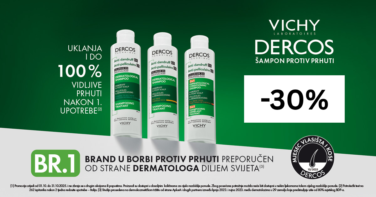 Iskoristite posebnu priliku i pobrinite se za zdravlje svoje kose uz 30% popusta na Vichy Dercos proizvode protiv prhuti u webshopu Prima Farmacia. Ova stručna linija šampona i tretmana učinkovito uklanja prhut, smiruje nadraženo vlasište i vraća prirodnu ravnotežu kože glave, a kosi pruža svježinu, volumen i lakoću.