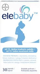 ELEBABY™ je posebna formula koja ukupno sadrži 18 vitamina i minerala te 200 mg omega-3 masne kiseline DHA (dokosaheksaenoična kiselina). Osim toga ELEBABY sadrži i poseban oblik folne kiseline (Metafolin®)* za koji je karakteristična bolja biološka upotrebljivost/bioraspoloživost i posljedično optimalan utjecaj na razvoj majčinog tkiva tijekom trudnoće. ELEBABY je razvijen za potrebe trudnica u drugom i trećem tromjesečju trudnoće.