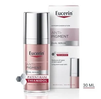 Eucerin Anti-Pigment Dual serum klinički i dermatološki dokazano smanjuje tamne mrlje i sprječava njihovo ponovno pojavljivanje uz pružanje mladenačkog izgleda kože. Prvi rezultati su vidljivi nakon dva tjedna i kontinuirano se poboljšavaju uslijed redovite primjene. Koža je zaglađena i izgleda obnovljeno, ujednačeno i sjajno.