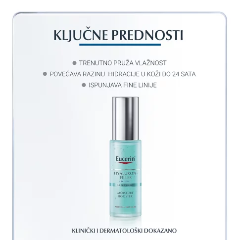 Eucerin Hyaluron-Filler hidratantni booster klinički i dermatološki dokazano pruža izvrsne rezultate. Povećava razinu vlage, kožu trenutno hidratizira i čini je vidljivo zategnutijom.
