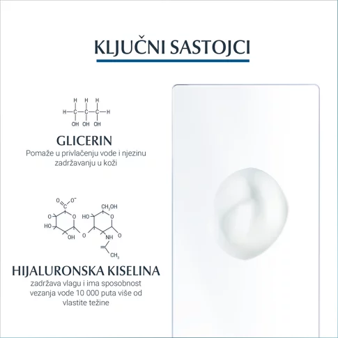 Formula koja sadrži samo 11 sastojaka kombinira dvije vrste visoko koncentrirane hijaluronske kiseline s glicerinom. Obje tvari se prirodno proizvode u stanicama kože kako bi se održala njezina vlažnost, a u formuli hidratantnog boostera djeluju kao magnet koji veže vlagu na površini kože.