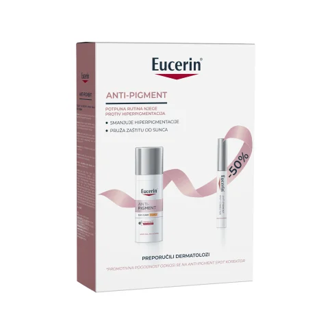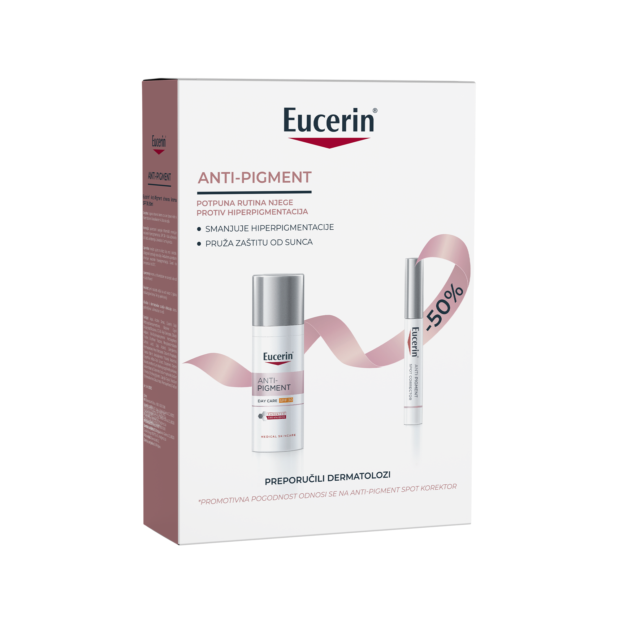 Eucerin Anti-pigment promotivno pakiranje koje sadrži hidratantnu dnevnu kremu namijenjenu koži s hiperpigmentacijama uz korektor iz iste linije po promotivnoj cijeni.