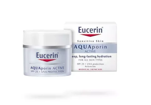Krema Eucerin AQUAporin ACTIVE s faktorom SPF 25 i UVA zaštitom inovativna je hidracijska krema koja pojačava hidracijski sustav kože, a kožu čini podatnom, glatkom i blistavom. Istodobno štiti kožu od oštećenja uzrokovanog UVB i UVA zrakama.