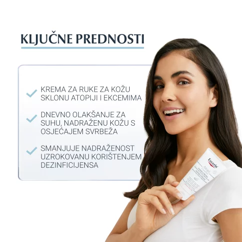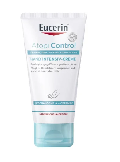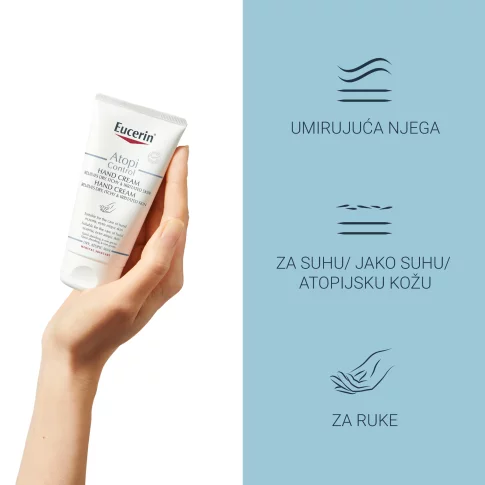 Eucerin AtopiControl intenzivna krema za ruke dnevna je njega koja regenerira i štiti kožu, sprječava suhe i crvene ruke te svrbež. Također smanjuje suhoću, crvenilo i iritaciju kože uslijed čestog pranja ruku.
