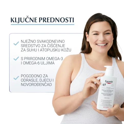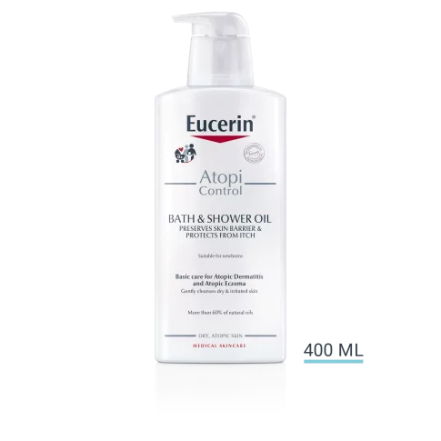 Kako sadržava više od 50% omega masti i drugih prirodnih ulja, visok postotak ulja omekšava kožu i štiti je od daljnjeg isušivanja te ublažava svrbež. Eucerin AtopiControl ulje za pranje nanosi se na mokru kožu tijekom tuširanja ili kupanja te je pogodno za odrasle, djecu i dojenčad od tri mjeseca nadalje. U slučaju korištenja za njegu dojenčadi, treba se koristiti jedino kao dodatak za kupanje.