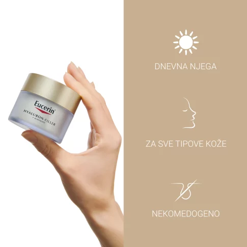 Jedinstvena formula pruža brojne anti-age pogodnosti. Eucerinova inovativna kombinacija visokomolekularne i niskomolekularne hijaluronske kiseline vidljivo ispunjava duboke bore. Arktin (aktivator koji dokazano ubrzava obnovu kolagena u stanicama kože) djeluje zajedno sa silimarinom (moćni antioksidans koji štiti kolagen i elastin od propadanja i poboljšava cirkulaciju na staničnoj razini). Koža postaje čvršća i zaglađenija te svježeg i sjajnog izgleda.