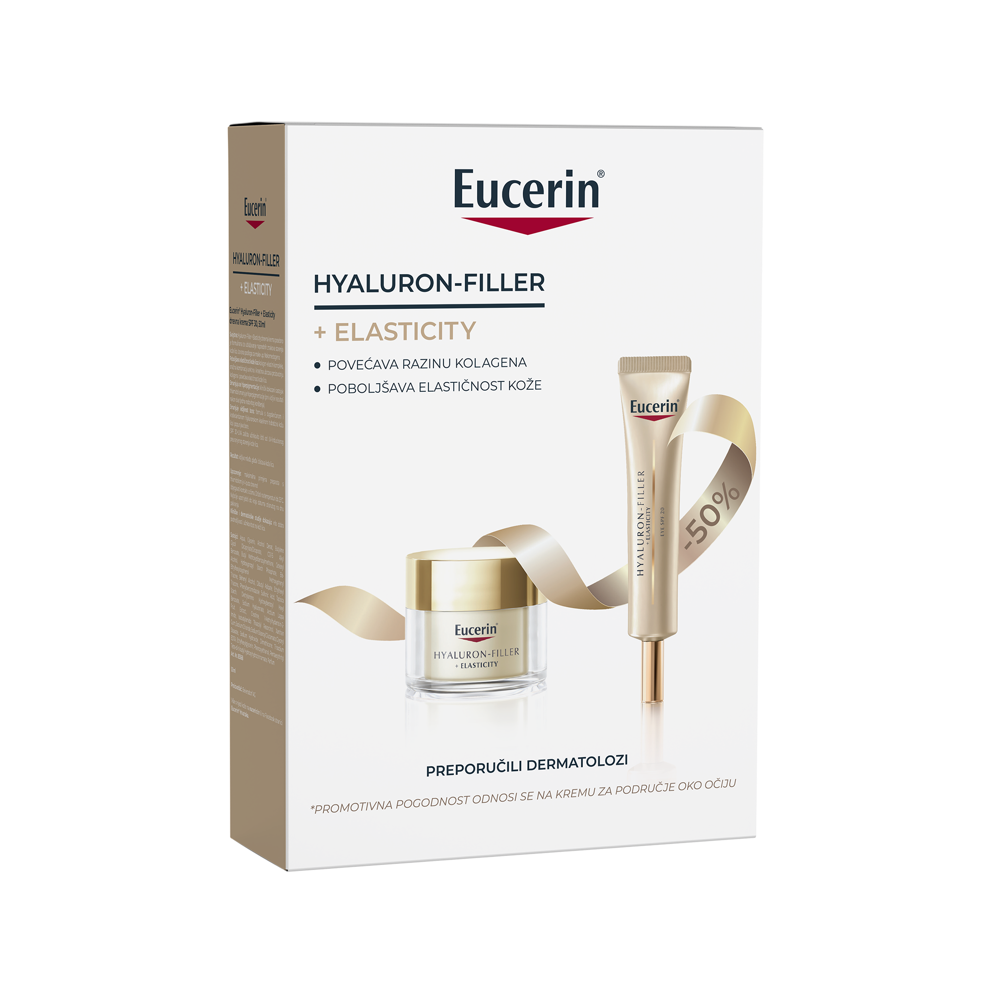 Eucerin Hyaluron-Filler Elasticity promotivno pakiranje koje sadrži hidratantnu dnevnu kremu namijenjenu svim tipovima kože uz kremu za oči iz iste linije po promotivnoj cijeni.