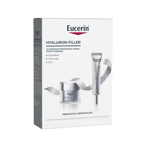 Eucerin Hyaluron-Filler promotivno pakiranje koje sadrži hidratantnu noćnu kremu namijenjenu svim tipovima kože uz kremu za oči iz iste linije po promotivnoj cijeni.
