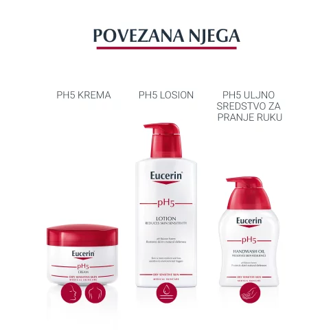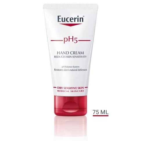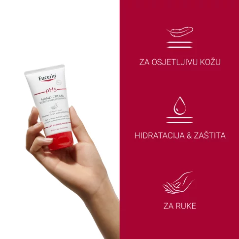 Eucerin pH5 krema za ruke posebno je razvijena da suhu i osjetljivu kožu ruku čini otpornijom i štiti je od isušivanja. Jedinstven Eucerin pH sustav ravnoteže sadrži citrični pufer, derivat citrične kiseline koji obnavlja i održava optimalnu pH vrijednost kože. Formula sadrži i dekspantenol, aktivni sastojak poznat po svojim regenerativnim i iscijeljujućim svojstvima. Obnavlja prirodne obrambene mehanizme kože i smanjuje osjetljivost kože.