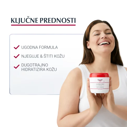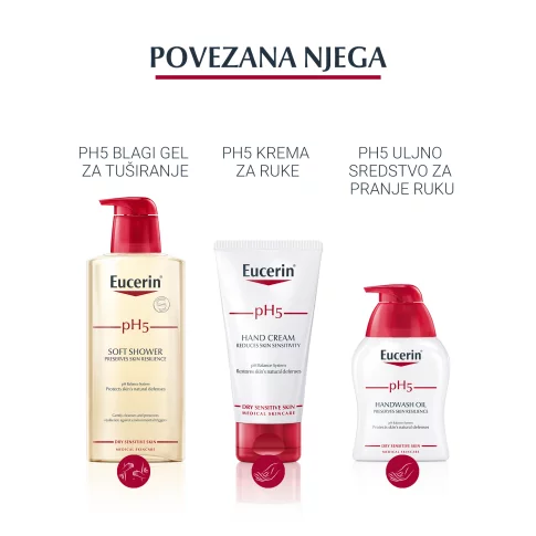Eucerin pH5 blaga krema za tijelo posebno je stvorena da suhu i osjetljivu kožu učini otpornijom i manje osjetljivom. Jedinstven Eucerin pH Balance System sadrži citratni pufer, derivat citrične kiseline koji obnavlja i stabilizira optimalni pH vrijednost kože. Formula sadrži i dekspantenol, aktivni sastojak poznat po svojim regenerativnim svojstvima.