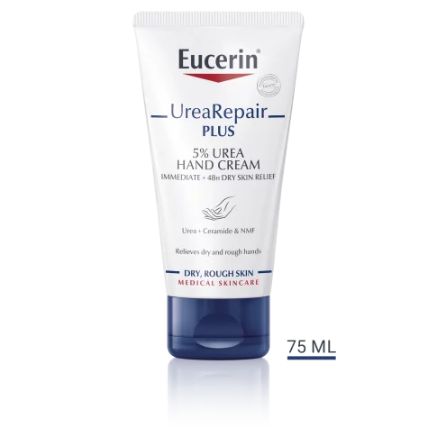 Eucerin Urea repair plus krema za ruke s 5% ureje namijenjena je za dnevnu njegu suhe i izrazito suhe kože ruku. Bogata formula Eucerin Repair kreme obnavlja hidrolipidni sloj te štiti kožnu barijeru od daljnjih oštećenja. Nemasna tekstura ne ostavlja masne tragove na koži. Brzo se upija i čini kožu mekanom i glatkom.