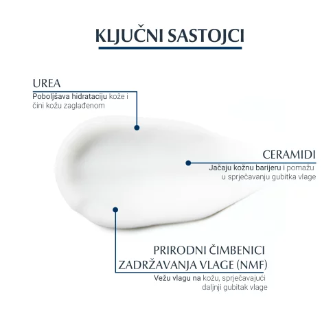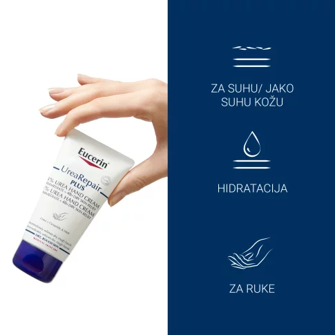 Eucerin UreaRepair PLUS krema za ruke sa 5% ureje pruža suhoj i gruboj koži potrebnu dnevnu njegu. Sadržava jedinstvenu i visoko učinkovitu kombinaciju sastojaka - urea, ceramidi, prirodni čimbenici zadržavanja vlage (NMF) - koji vežu vlagu i obnavljaju prirodnu zaštitnu barijeru kože kako bi se spriječio daljnji gubitak vlage. Formula klinički i dermatološki dokazano pruža trenutno olakšanje i intenzivnu, dugotrajnu hidratizaciju za suhe, grube ruke, čak i nakon učestalog pranja. Ojačava prirodnu kožnu barijeri i odgađa simptome suhe kože do 48 sati.