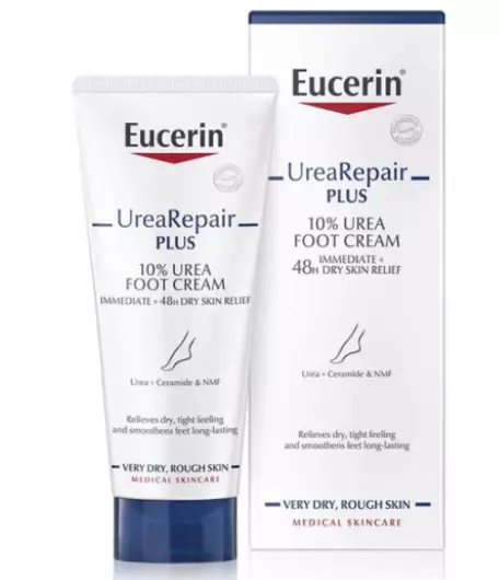 Eucerin 10% Urea krema za stopala namijenjena je za njegu suhih i izrazito suhih, grubih i ispucanih stopala te za primjenu kod orožnjele kože, ispucale kože i pritisnutih mjesta.